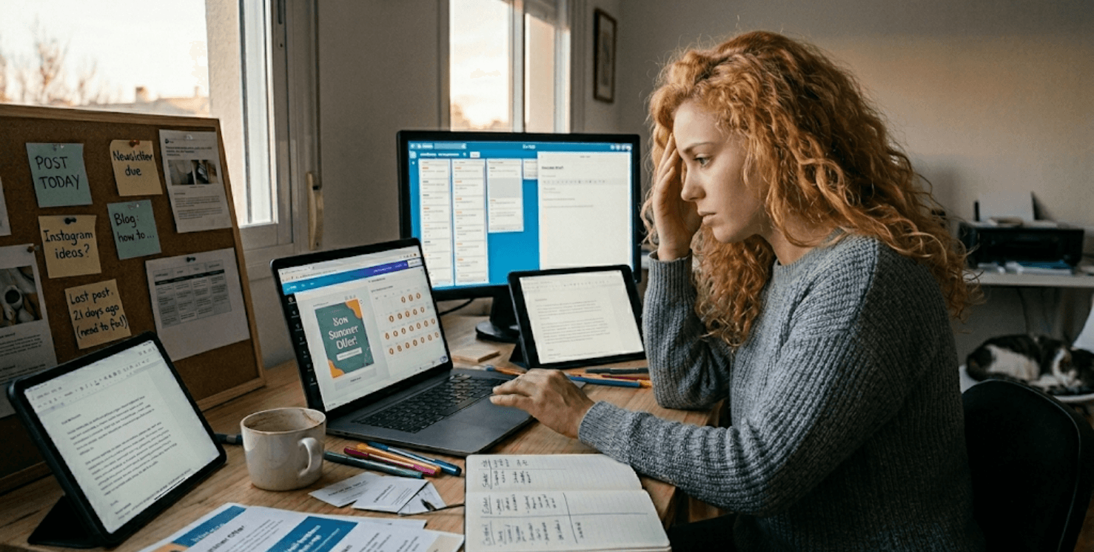 You try to DIY it. Spend 3 hours every Sunday creating posts for the week. By Tuesday you are behind. By Thursday you give up.